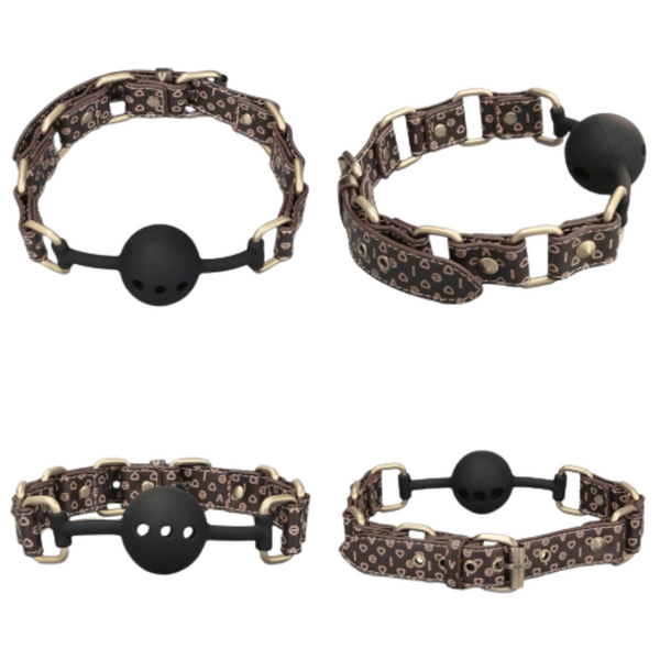 Immerse yourself in a blend of luxury and rustic charm with our Rebellion Reign Ball Gag. This statement piece has been crafted from premium PU. Six antique bronze spikes punctuate the rich brown faux leather, adding an extra layer of unique flair and signifying the brand's rebellious spirit. A breathable silicone ball, 1.6 inches in diameter, sits ready to challenge and thrill. Its breathability ensures safety and comfort without detracting from the allure of its use. The straps of the ball gag have a convenient length of 23 inches and a width of 1 inches, offering a flexible fit that conforms to the shape of your face. Every aspect of the Rebellion Reign Ball Gag speaks of meticulous attention to detail and a distinctive design language.